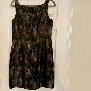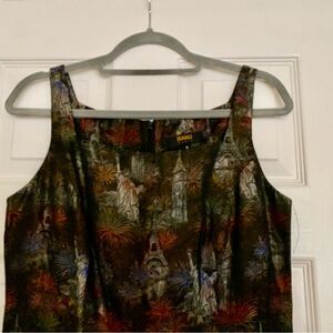 BANU Paris jacquard dress featuring a detailed pattern of iconic landmarks like the Eiffel Tower, the Statue of Liberty, and possibly Big Ben, interspersed with what appear to be fireworks or floral bursts. It's a sleeveless, knee-length dress with a fitted silhouette, hung on a hanger against a white door. The dress's fabric has a rich, textured look due to the jacquard weave, giving it a formal or special occasion feel. Banu Paris is known for creating unique and eye-catching designs, often incorporating intricate patterns and luxurious fabrics. This particular dress, with its cityscapes and celebratory motifs, suggests a theme of travel or festive occasions.