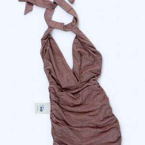 Introducing the "Donna Dress" in Sorbett Ð a stunning mini dress with a halter neck that ties at the back and a deep V-neckline that drapes elegantly. The dress features an open back, creating a bold and alluring look. Fitted to the body and fully ruched, it accentuates your curves beautifully. Perfect for a night out or a special event.