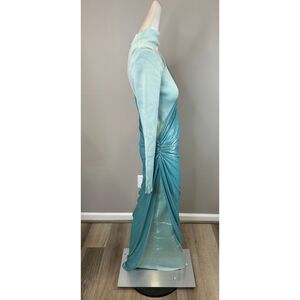 Introducing the "Elsa Dress" in Moana - Designed in an ocean-inspired hue, featuring high neck knits and an opening, making it a unique piece. From the use of different textures, this silhouette creates natural movement. Covered in a removable glossy mesh, this dress can be used to elevate any look with pure sophistication.