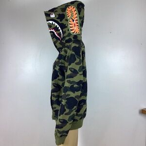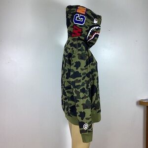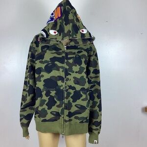 Great lightly preowned condition Bathing Ape green camo zip up hoodie. Size Medium. Length from shoulder 25”. Sleeve length 24”. Chest 44”.
