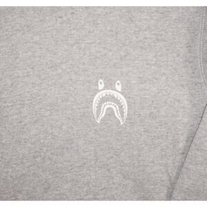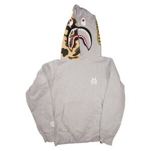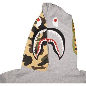 Authentic A Bathing Ape (BAPE) Shark Full Zip Hoodie in heather gray with signature camo/tiger/WGM hood. Features BAPE’s iconic full zip shark face graphic on the hood, camo paneling, tiger embroidery, and WGM varsity lettering. Small shark chest logo and BAPE woven tab at hem.