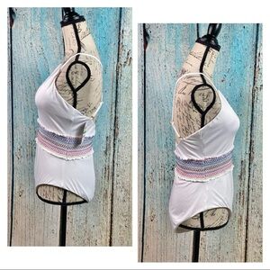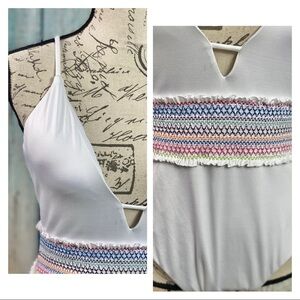 A plunging V-neckline lends a modern look to this one-piece swimsuit for Bar III, styled with a smocked waistline that comes alive with multicolor stitching
