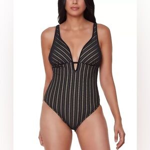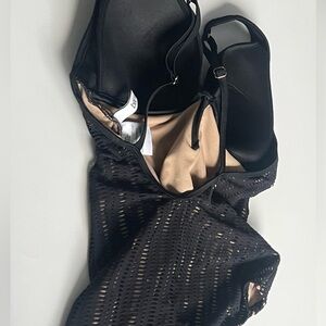 BAR III Plunging Crochet One-Piece Swimsuit Black Nude Lined Pull On New M