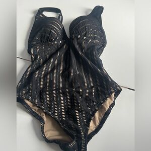BAR III Plunging Crochet One-Piece Swimsuit Black Nude Lined Pull On New M