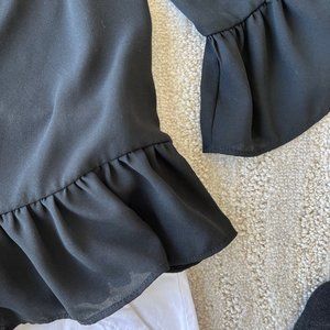This black blouse features a round/boat neckline. The neckline is also elastic. Ruffles are found at the bottom of the hem and at the end of the wrists. Blouse is in good condition. It's made of 100% Polyester.