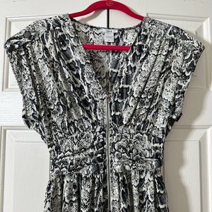 This dress is like new and is in excellent condition! It has several flattering features and fits very well. It hugs your body at the right places and has just the right amount of flair. It is a size medium with 3/4 zip front, cinched/pleated waist, with tabbed shoulders. It has capped sleeves with button detail on the shoulder. Black and white snakeskin print, great for casual or semi-formal events.