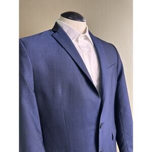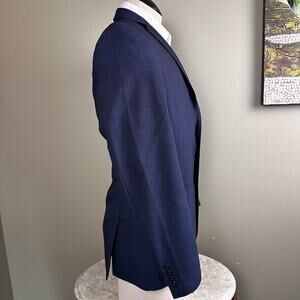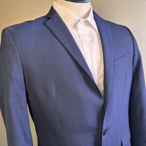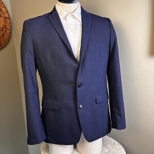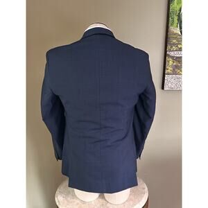 BAR III for Macy's 100% wool Men's 40R slim fit jacket with double vents and 2 button front in Navy Blue - Excellent condition. Front pockets are still sewn down it is so unused ! This is one of Macy's upper level jackets for BAR III. My FLAT measurements are; Chest (pit to pit) 20", Waist 19", Hip (I included a second becasue of the slim fit) 20", sleeve is 25 " from top shoulder seam to the end of the cuff, shoulders Top 18.5" , and length from bottom of collar to end of hem is 30". beautiful suit that is on sale at Macy's for $175. Please feel free to message me I am happy to answer any questions or meet any requests for more measurements or photos :). Thank you for your consideration of this classy quality Navy sport coat in light weight wool from BAR III of Macy's !