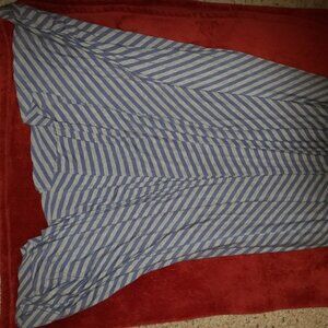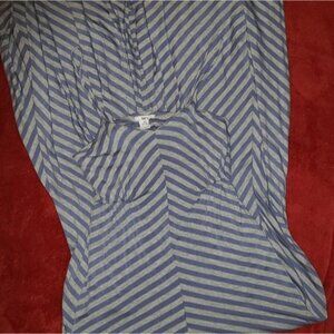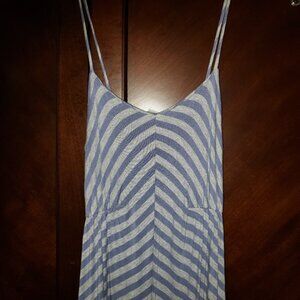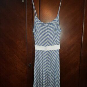 Unique BAR III maxi dress. Blue and grey striped, spaghetti straps, sightly assemetrical across the bottom, stretchy. White elastic across the lower back. Definitely for taller girls, I'm 5'3 and have to wear 4 inch heels with this.
