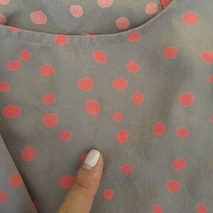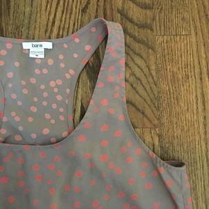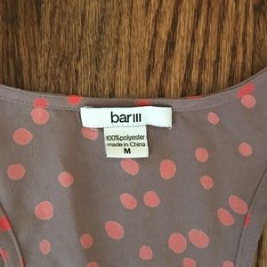 BAR lll Flowy Tank. It's 100% polyester with a racerback. The color is a light mauve with hot pink spots. Fun for summer. There is a slight discoloration on the front but very subtle.