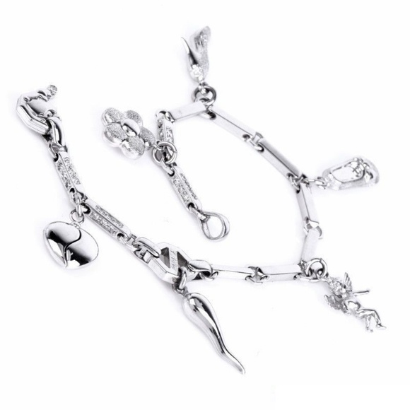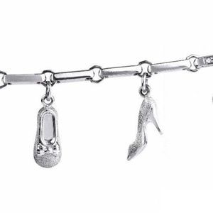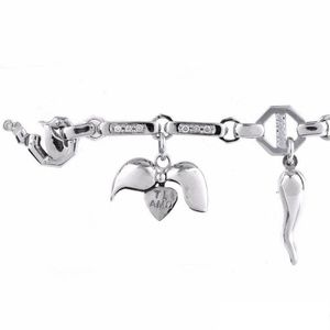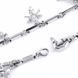 This lovely bracelet showcasing multiple charm design with unique rectangular links encrusted with 49 genuine round-cut Diamonds approx: 0.50cttw prong set and features six different motif charms (Heart, Pepper, Angel, Ballerina Shoe, High Heel Shoe and Flower). This gorgeous bracelet secures with a spring ring. Finished with a bright polish, this bracelet remains in very good condition!!!