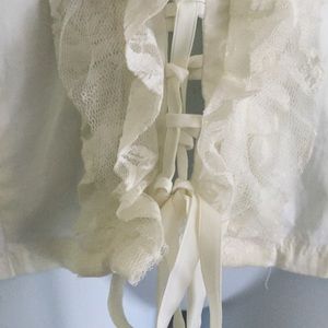 Elegant, romantic top with lacy ruffles going up the front and at the sleeves. Fastened by ribbons lacing down to the ends.