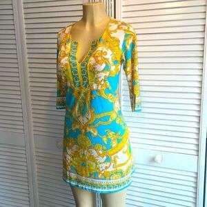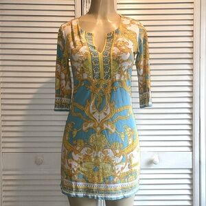 Beautiful Barbara Gerwit Seashell Print Design Dress of colors gold, white, and blue with shells and starfish details.
