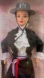This Chilean Barbie Doll, Dolls of the World Series, is dressed in a classic style outfit that is often worn by Chilean cowboys, known as the huaso. This costume is traditional attire for rodeos and roundups. It features a black bolero jacket with a white shirt underneath that is accented with ruffles around the neck and cuffs. A ruffled bib on the chest adds a festive flair. It is paired with a long black skirt. The Chile doll is wearing a black, flat-topped hat with a wide brim and a strap around the neck, embellished with blue, white and red ribbons, the colors of the Chilean flag. Around the waist, ribbons in the same color scheme add the finishing touches.