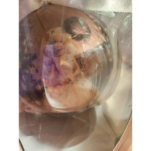 This listing is for a NIB 4" round Barbie Christmas ornament with stand and wooden base. The box shows wear and creases, but the ornament was de-boxed for the first time when we took pictures. Stand is 8.5" tall