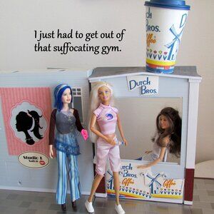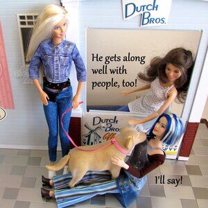 In this listing, you get: The blonde Barbie with arms and legs that bend, the two outfits she wears, her water bottle, and. . .her new dog! (None of the other dolls or background props are included.) She has very silky blonde hair with honey-colored streaks, light blue eyes, and a very happy smile. She has high-heeled feet. Her dog is a Yellow Lab with a pink collar and leash. His nose is a bit rubbed, which makes him look like a mature dog whose nose has changed color. Realistic!
