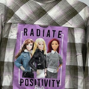▪️Gray black white light pink plaid bold flannel oversized button down w/Fabulous Graphic Picture of your favorite-BAND-CHARACTER-STYLE -ETC