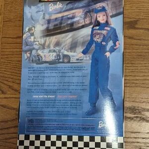 Mattel's Barbie 50th Anniversary NASCAR Collector Edition Nib Hot Wheels doll adds another profession to Barbie's ever-growing list of titles: NASCAR driver. Clad in a blue jumpsuit, NASCAR Barbie's outfit is accurate right down to the sponsor logos. Rather than use logos from real companies, though, Barbie's sponsors are Hot Wheels, a fun nod to Mattel's other big toy franchise.