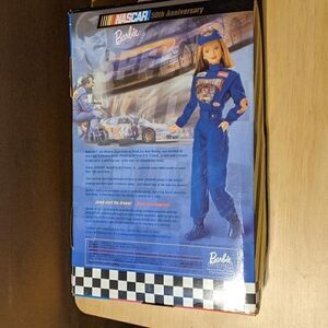 Mattel's Barbie 50th Anniversary NASCAR Collector Edition Nib Hot Wheels doll adds another profession to Barbie's ever-growing list of titles: NASCAR driver. Clad in a blue jumpsuit, NASCAR Barbie's outfit is accurate right down to the sponsor logos. Rather than use logos from real companies, though, Barbie's sponsors are Hot Wheels, a fun nod to Mattel's other big toy franchise.