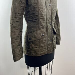 Barbour Cavalry Polarquilt Olive Green Jacket Quilted Snap Front Mock Neck Sz 4