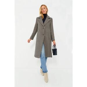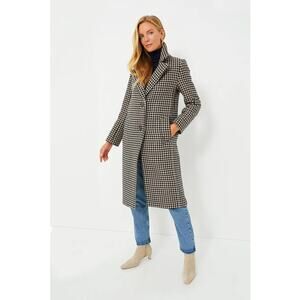 Description: Notched lapels. Long sleeves. Button-front closure. Single-breasted. Side slit pockets. Relaxed fit. Hits just below the knee. Black and light fawn houndstooth pattern. Jacquard lining.