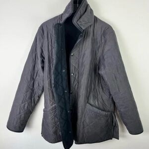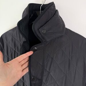 Men’s Barbour quilted and fleece lined jacket. Front zip with 2-way zipper. Snap closure. Open front pockets. Zippered inside pocket. Detachable snap-on neck piece. Snaps at side hem.