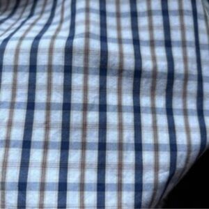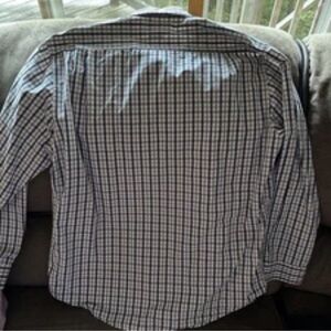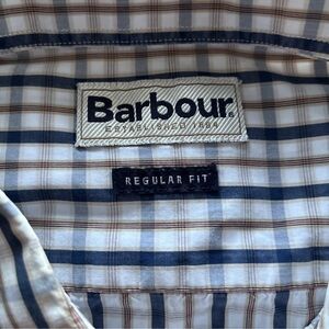 Nice worn once mens barbour button down long sleeve blue/brown/white plaid shirt excellent condition no stains at all pit to pit is 24”