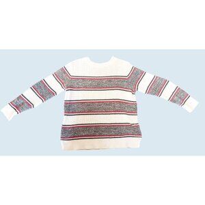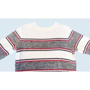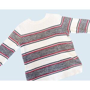 Great sweater by Barbour. Merseyside striped sweater. Textured fabric. Pullover. Side split hems. White, red, black, grey. Crew neck. 100% cotton. Size 8. Pre-owned and gently worn in really nice condition!