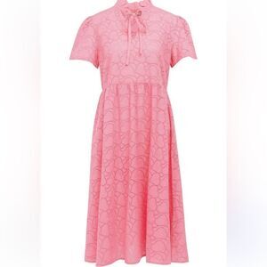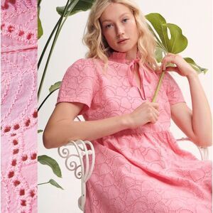 Leafy lace appears like hearts fluttering across a petal pink dress, sweetened with a tied, frilly neckline and cut from pure cotton. Split neck with ties Short sleeves Side-seam pockets 100% cotton Machine wash, line dry Imported