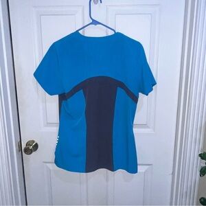 This Barco Uniforms t-shirt features a vibrant blue color with contrasting gray side panels, offering a sleek and modern look. Designed with short sleeves and a fitted style, it provides both comfort and a flattering silhouette. Ideal for casual outings or active wear, this top combines style and functionality effortlessly.