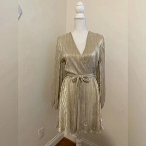 BARDOT Bellissa Pleated Long Sleeve Faux Rap Dress in Champagne Size Small NWOT