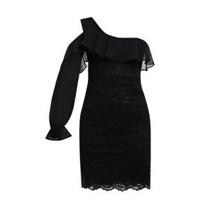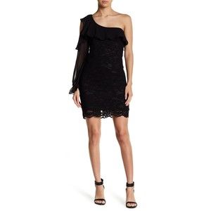 NEW BARDOT Black Fiorella One Cold Shoulder Sleeve Lace Ruffle Dress Size: 8 / Medium Color: Black One-shoulder neckline - One long sheer sleeve with ruffle detail. Back zip closure - Ruffle popover - Lace construction - Lined. Bust: 36in. Waist: 32in. Hip: 39in. Length: 35in. Main: 77% cotton, 23% nylon Contrast: 100% polyester. Hand wash cold. Imported. Brand New without tag.