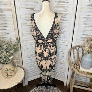 BARDOT NEW Women's 12 XL Embroidered Nude Black Overlay Midi Dress Sexy Sheath