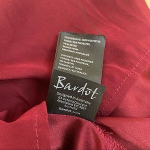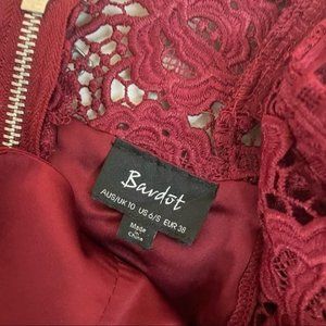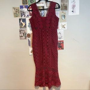 absolutely stunning gorgeous flattering romantic girly and feminine v neck sleeveless crochet lace style body con dress fully line with drop hem ruffle flounce mermaid style hem in the style odyssey in the colorway wine from the brand bardot