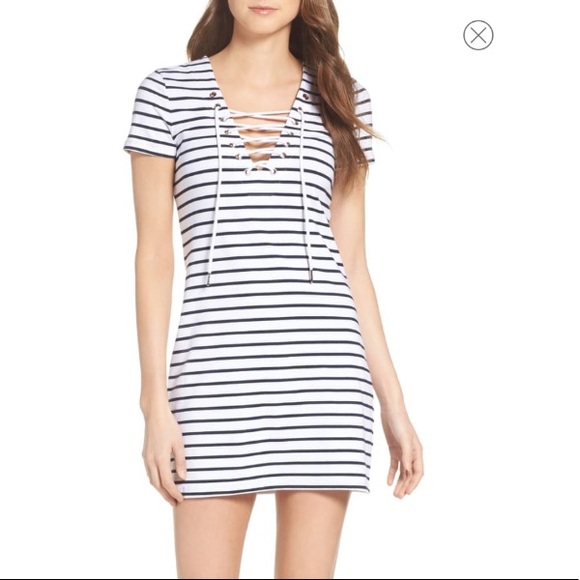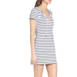 Crisp stripes and swingy drawstrings at the plunging lace-up neck bring jaunty attitude to a short-sleeve dress cut from a soft, stretchy cotton knit.