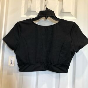 Bare Necessities makes this ladies size LARGE Black Textured-Knit Crop Top with bow and peephole. It’s made of 92% polyester and 8% Elastane. It’s lined with 88% polyester and 12% spandex. It has removable molded cups. Cute V-neck with tidy small bow above peephole. 2” band around chest and short sleeves. The pit-to-pit measurement is 18” (without stretching), the length is 14” and the sleeves are 6”. The banded ribcage has a circumference of 30” (again, without stretching at all). This is adorable and versatile and NWT!
