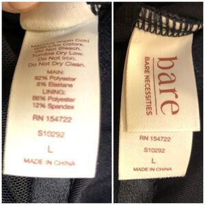 Bare Necessities makes this ladies size LARGE Black Textured-Knit Crop Top with bow and peephole. It’s made of 92% polyester and 8% Elastane. It’s lined with 88% polyester and 12% spandex. It has removable molded cups. Cute V-neck with tidy small bow above peephole. 2” band around chest and short sleeves. The pit-to-pit measurement is 18” (without stretching), the length is 14” and the sleeves are 6”. The banded ribcage has a circumference of 30” (again, without stretching at all). This is adorable and versatile and NWT!