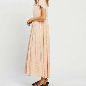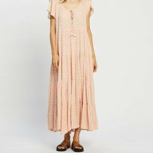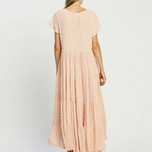 Crafted from soft 100% Rayon in a pretty peach saffron floral print. Relaxed cut with floaty tiers, scooped neckline with shell buttons and cute tassel tie.