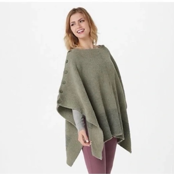 Barefoot Dreams CozyChic coastline poncho in a eucalyptus/ agave color. One size fits most. Contrast heather yarn border. Ribbed neckline and side seams. Signature coconut side buttons. Relaxed fit