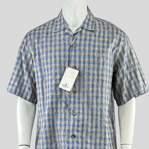 BARENA VENEZIA Solana Oversize Camp Shirt size Euro 48. Short sleeve. Button front with spread collar. Two patch pockets. Blue and tan plaid. CONDITION: Excellent. Purchased vintage with resale tags, unworn.