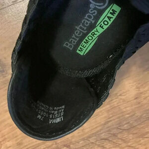 BARETRAPS Black Stretch Peep Toe Wedge Sandals Slip On Open Toe Womens Size 7