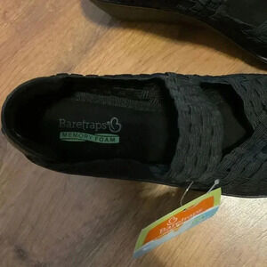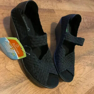 NEW BARETRAPS Black Stretch Peep Toe Wedge Sandals Slip On Open Toe Womens Size 7