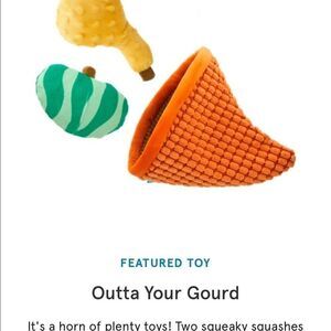 It's a horn of plenty toys! With a crinkly cornucopia of fun in store, hide treats inside or squash these gourds to make 'em SQUEAK!