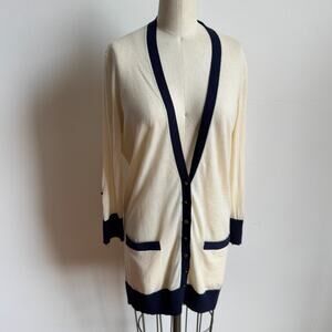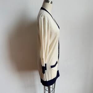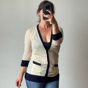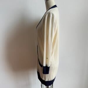 Details: BARNEY'S CO-OP ivory wool cashmere blend cardigan with navy trim. Deep v-neck, buttons to the waist, 2 slit pockets, 3/4 sleeves with strap and button to keep them rolled up. Light weight, soft, slightly sheer.