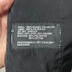Material shell 100% bonded polyester lining: 100% polyester zip out warmer: body 65% wool 35% viscose sleeves: 65% polyester 35% cotton