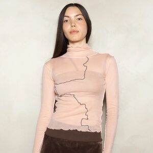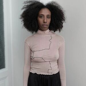 The Gerrymandered turtleneck by Baserange in Buio Pink is one of their iconic and most loved designs. Form-fitting fine cotton turtleneck with Baserange's signature lettuced finish on the sleeves, neckline and hem. Features an ambiguously traced geopolitical border adorning the front as part of the Gerrymandering series. The semi-sheer organic cotton gauze is very fine and slightly sheer. Works well with a cute Baserange bra underneath.