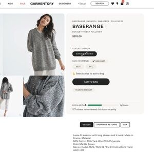 The Beasley sweater from BASERANGE is so chic with a refreshing higher neck that looks clean and modern. Finely knit cotton, ribbed V-neck, long dropped sleeves with ribbed cuffs and hem. The side stitching on this is so beautiful as there is no seam (see 11th pic). I'm not a knitter so I don't know what this is, but I love it. It's a barely there stitch and it looks so chic and cool.