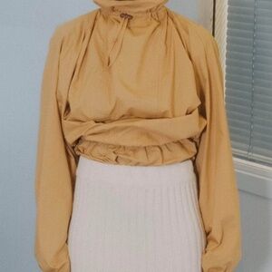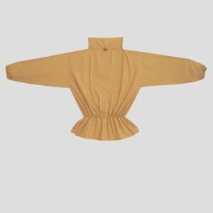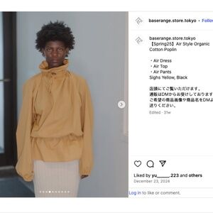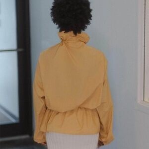 The Air Top soldout fast in Size Small when it came out in Spring 2025. Organic cotton poplin top from Baserange, with an elastic waistband and elastic cuffs. Drawstring with toggle at the neck and slits at side seams. The color Sighs Yellow is like a rich goldenrod. Pair with the matching Air Pants for a cool monochrome look or with Ole pants. Dress up for a night out or with boxers (or not !) for staying in. Change up the look by pulling the waistband low or high and tightening the neck cord. Dreamy design and color can work as a light Autumn jacket too. Loose fit is true to size. Models wear Small. Designed in France & Made in Turkey.