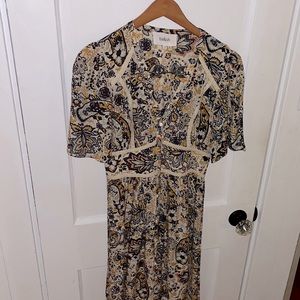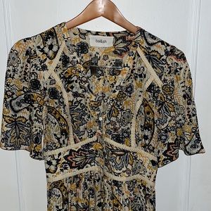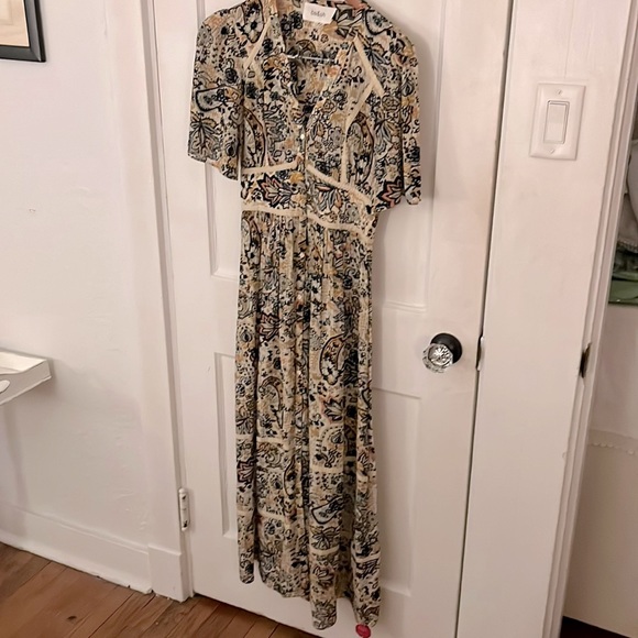 Beautiful ba&sh maxi dress with buttons all the way up the front. Two buttons are missing and a couple need to be secured. Price takes this into account. This is nwot - my daughter decided not to wear this for a special event and now it’s too small. My loss is your gain!!