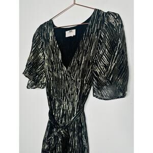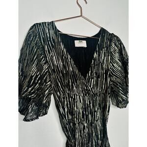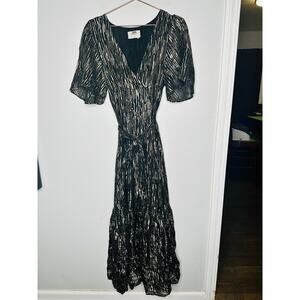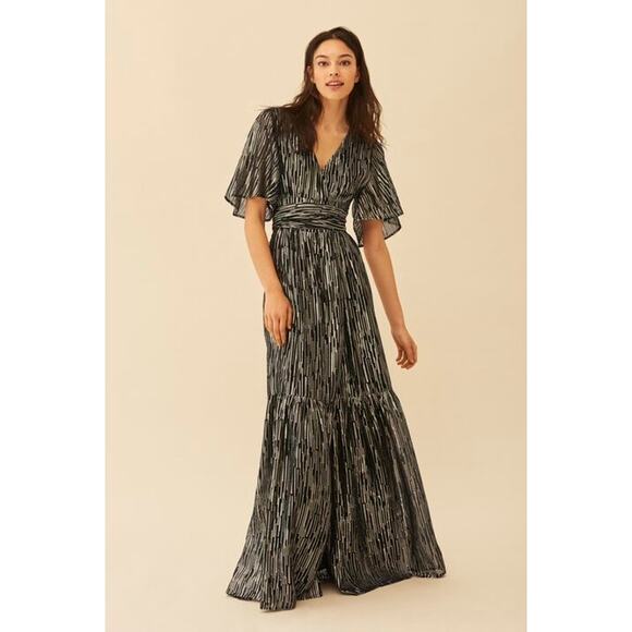 BA&SH Black Gold Metallic V-Neckline Nixon Short Sleeve Maxi Dress Size US 6