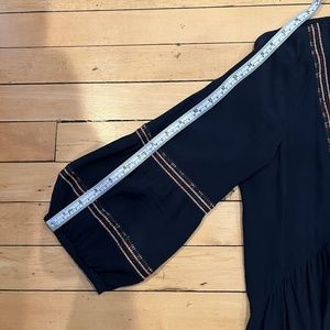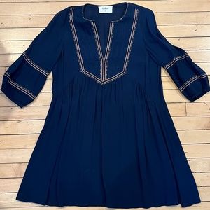 Dark blue v-neck mini dress with multi-colored embroidered detailing, ruched bodice, 3/4 sleeve, relaxed silhouette. BA&SH size 2 is equivalent to a US size medium. Fabric is 100% viscose. Very good condition. 38" Chest, 34" Length See other measurements in photos.